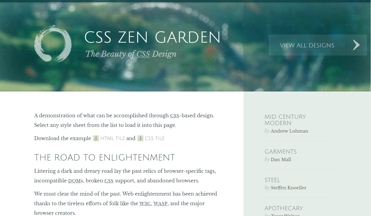 So What is This About? There is a continuing need to show the power of CSS. The Zen Garden aims to excite, inspire, and encourage participation. To begin, view some of the existing designs in the list. Clicking on any one will load the style sheet into thi