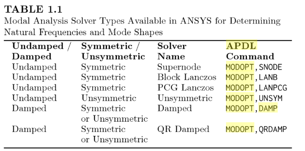 MODOPT, Method, NMODE, FREQB, FREQE, Cpxmod, Nrmkey, ModType, BlockSize, --, --, --, FREQMOD