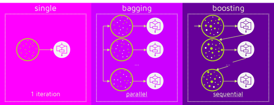 - 서로 다른/또는 같은 알고리즘을 단순히 결합한 형태도 있으나, 일반적으로 배깅(Bagging)과 부스팅(Boosting) 방식으로 나뉨