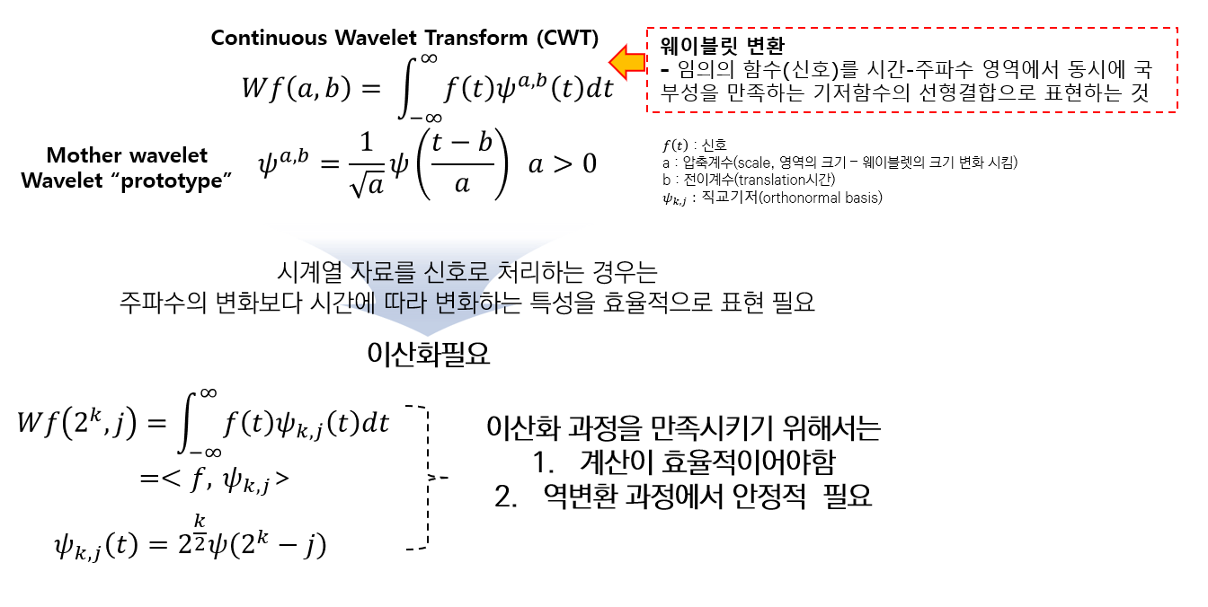 - 웨이블렛 변환은 단시간 푸리에 변환보다 자료를 처리함에 있어서 유연한 해석 가능.