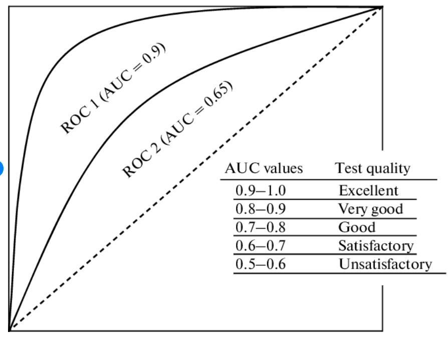 - ROC 곡선 밑의 면적을 구한 것으로서 일반적으로 1에 가까울수록 좋은 수치