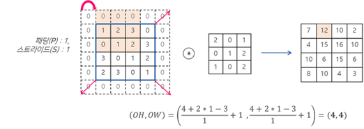 Ex) 패딩 1 스트라이드 1 일때의 출력데이터 크기를 구한 예제