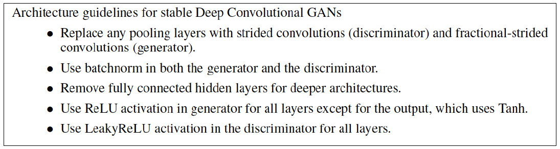 안정적으로 GAN을 학습시킬 수 있는 Deep Generative Adversarial Networks(DCGAN) 구조를 제안